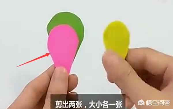 8、同样步骤再剪一张粉红纸和黄纸,粉红纸比绿色纸小些,黄色比粉红色小些。