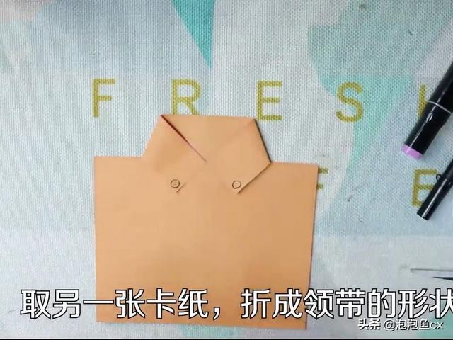 3、取另一张卡纸,折成领带的形状,画上图案。